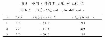 截距ΔHm為ΔSom=0時體系的焓變,意味著此時膠團化過程完全依賴焓變的驅動。顯然,ΔHm越小,表明此過程體系的能量降得越低,因而對應的膠團結構越穩(wěn)定。從表3看,n=1的膠團相對最穩(wěn)定。表5還給出ΔHom=0時對應的體系熵變值ΔSm,此時膠團化完全由熵驅動,數據也顯示n=1的膠團化傾向最大。