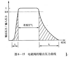 電磁閥的開啟、關(guān)閉滯后時(shí)間是衡量電磁閥靈敏性的指標(biāo),開啟滯后時(shí)間是從電路剛一接通,到輸出壓力上升到輸入壓力90%時(shí)的時(shí)間;關(guān)閉滯后時(shí)間是從接到關(guān)閉電信號(hào)到壓力下降到原來的90%的時(shí)間。電磁閥把電脈沖信號(hào)轉(zhuǎn)換成機(jī)械動(dòng)作,機(jī)械動(dòng)作的響應(yīng)在時(shí)間上會(huì)滯后于電信號(hào),而氣路接通又滯后于機(jī)械動(dòng)作是造成啟閉滯后的原因。電磁閥的輸出壓力曲線如圖6—15所示,時(shí)間t1和t2越小,電磁閥越靈敏,其高速響應(yīng)特性越好。壓力曲線中的陰影部分反映的是無效氣流,因此壓力曲線越接近矩形,越能減少電磁閥啟閉造成的氣耗。