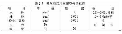 噴氣引緯使用的壓縮空氣必須是無水、無油,滿足噴氣引緯壓力和溫度要求的潔凈空氣,噴氣引緯用壓縮空氣的標(biāo)準(zhǔn)如表2-5所示。壓縮空氣中過量的水分、油分和雜質(zhì)對引緯系統(tǒng)及供氣管道會造成嚴(yán)重危害:機(jī)器及供氣管道銹蝕;供氣管道等粘著灰塵等異物,使管內(nèi)空氣阻力增加,壓力損失增加,嚴(yán)重時會逐漸堵塞輔助噴嘴的出氣小孔或使閥門失靈,影響噴氣引緯的正常進(jìn)行;污染鋼筘,使引緯狀態(tài)惡化,引緯效率下降,影響織物質(zhì)量。過量的油分還會污染織物,影響工作環(huán)境。