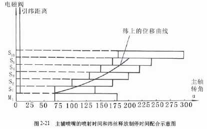 儲氣筒2穩(wěn)定供氣壓力,在規(guī)定的時間提供給主噴嘴、輔助噴嘴、吸緯噴嘴等需要壓縮空氣工作的裝置。噴氣引緯的供氣系統(tǒng)如圖2-20所示。
