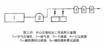 制備上述高質(zhì)量的壓縮空氣使用中心壓縮機(jī)站,中心壓縮機(jī)站工作流程示意圖如圖2-19所示??諝鈮嚎s機(jī)1將空氣加壓到噴氣引緯要求的壓力,壓入儲氣筒2,空氣在壓縮過程中被加熱,大量的水分凝結(jié)為冷