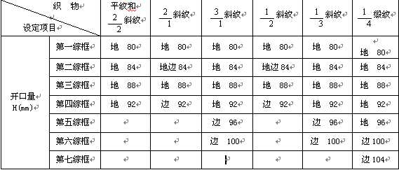織物品種不同、采用的開口機構不同,設定的開口量也不同,表6—3所示為一多臂開口機構在織制不同組織的織物時設定的開口量大小。