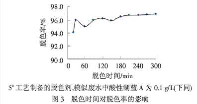 從圖3可以看出,30 min時(shí),脫色較為充分,脫色率達(dá)到較佳值,之后,隨著脫色時(shí)間的延長,脫色率變化不大.為了省時(shí)、節(jié)能,選取30 min為其最佳的脫色時(shí)間,此時(shí)脫色率可達(dá)到96.0%