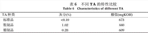 采用兩種不同的方法處理0min堿減量廢水:一種酸析前進行絮凝脫色(3#),得到TA精制品;另一種直接酸性,酸性得TA粗制品。將兩種TA與標準品TA相比較,如表6所示:精制TA較粗制品灰分降低72.5%,酸值提高38.4%,而純度提高了12.9%。說明酸性前廢水預處理的脫色絮凝作用對改善TA制品的特性效果明顯。精制品的各項指標已接近商品TA。圖1中三種不同TA的紅外圖譜也證明了這一點。