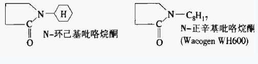 環(huán)保型染色載體是20世紀(jì)90年代開始研發(fā)的,要求無毒、無氣味、易生物降解,在較低溫度下保持液狀,易乳化,乳液貯存穩(wěn)定性好,合成容易,價格便宜,載體能力較強,載體染色物不降低日曬牢度和色光,不損傷纖維,殘留在織物上易洗除.118J要達(dá)到上述所有要求是非常困難的,被研究過的化學(xué)品有近百種,至今還沒有找到十分理想的載體,不是染深色效果不如冬青油,就是價格較貴,到目前為止,載體效果相對優(yōu)異的是N一環(huán)己基吡咯烷酮,其次是N一一正辛基吡咯烷酮,價格都很貴,它們的分子結(jié)構(gòu)式如下: