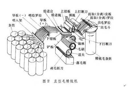 ?、萋涿懦龣C(jī)構(gòu)與棉精梳機(jī)類(lèi)似,但因落毛纖維比較長(zhǎng),需用道夫代替塵籠起凝聚的作用。附設(shè)的剝毛斬刀將落毛從道夫表面剝下,連同毛刷高速回轉(zhuǎn)中所拋出的雜質(zhì)一并納入落毛箱內(nèi)。