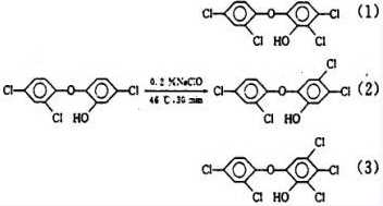 抗菌防臭整理劑按其化學(xué)結(jié)構(gòu)可分為:醇類、酚類、醛類、酯類、醚類、腈類、鹵素類、吡啶、喹啉類、噻唑類、雙胍類、二硫化合物、硫代氨基甲酸酯類、(多)糖類、表面活性劑類、無機化合物、金屬類以及天然化合物等。但有些抗菌防臭整理劑有不良的副作用,已禁止在服裝面料方面使用。如著名商品Irgasan DP300,其學(xué)名為2,4,4'-三氯-2'-羥基二苯醚,其整理產(chǎn)品與含氯漂白劑作用后,會生成三種有毒的氯化物,反應(yīng)式如下: