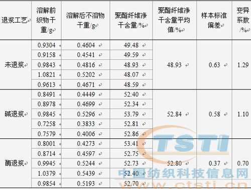 退漿工藝 溶解前織物干重/g 溶解后不溶物干重/g 聚酯纖維凈干含量/% 聚酯纖維凈干含量平均值/% 樣本標準偏差 變異系數(shù)/%