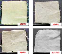 對同一織物采取四種不同的退漿方式,對比織物退漿前后失重率。試驗結(jié)果如圖3所示,四種退漿工藝下樣品的失重率基本保持在10%左右,不同工藝條件下的退漿效果差異不大。其中,堿退漿工藝獲得的失重率最高,可能是堿液在煮沸過程中對樣品中的聚酯纖維成分產(chǎn)生破壞,造成重量損失。此外,通過對退漿后的織物圖像(如圖4所示)觀察比較發(fā)現(xiàn),氧化退漿的樣品在去除漿料的同時獲得了漂白效果。