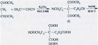 棉、麻、絲織物及粘膠纖維在紡織印染過程中易產(chǎn)生劇烈的收縮,自身又缺少彈性,防皺性較差.為克服以上缺點,需對上述纖維進行化學(xué)防皺整理.隨著國內(nèi)外對綠色環(huán)保的日益重視,開發(fā)無甲醛整理劑代替?zhèn)鹘y(tǒng)的N一羥甲基酰胺類整理劑已成為必然的發(fā)展趨勢.[1-31近年來,國內(nèi)外對棉織物的低甲醛或無甲醛化學(xué)抗皺整理的研究非常多,其中多元羧酸1,2,3,4一四羧酸丁烷(BTCA)是一種性能優(yōu)良的無甲醛抗皺整理劑,但成本過高,很多印染廠無法承擔(dān)4引]活潑亞甲基化合物的邁克爾加成反應(yīng)是有機合成中制備多羰基化合物的一類重要反應(yīng),對其反應(yīng)體系的研究一直受到廣泛的重視[8-121本文以丙二酸二甲酯和丙烯腈為主要原料,利用活潑亞甲基化合物的邁克爾反應(yīng),以PEG2000為相轉(zhuǎn)移催化劑,無水碳酸鉀為堿劑,正己烷為溶劑,合成得到了目標產(chǎn)物DEMN(4,4一二甲酸基一1,7一庚二酸).并將DEMN應(yīng)用于棉織物的抗皺整理,通過折皺回復(fù)性能、白度及強力保留率(BSR)表征該無甲醛整理劑的抗皺效果.合成過程如下: