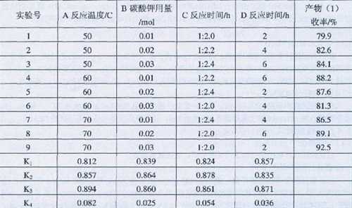 由表1可知,產(chǎn)物(I)合成的最優(yōu)方案為A382C2D3,即碳酸鉀用量為0.02mol,反應(yīng)原