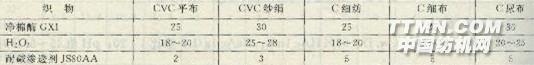 以同一坯布(60×60,90×88)做試驗(yàn),用凈棉酶處理的織物其強(qiáng)力損傷小,甚至不損傷纖維,失重率低,織物厚實(shí)、豐滿。 ②不同織物凈棉酶生產(chǎn)處方及毛效情況(表3—55、表3—56)。 表3-55各種織物酶練處方 單位:g/L