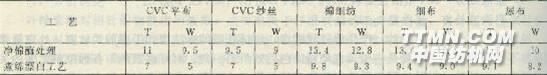 生物凈棉酶GXI的前處理生產(chǎn)實(shí)踐(江蘇省南通市) (1)品種 CVC48”45×45 110×76 3000re CVC48”20×20 100×53 50000m C 67"60×60 90×88 20萬(wàn)米 C 50”40×40 50×50 1萬(wàn)米 C尿布36”21/2×10 85×88 2萬(wàn)米 (2)使用凈棉酶工藝流程 坯布→檢驗(yàn)→攤布→縫頭→燒毛→凈棉酶處理→絲光→拉幅→染色→柔軟拉幅→防縮→成品。 (3)常規(guī)工藝流程 坯布→檢驗(yàn)→攤縫→煮退→氧漂→絲光→拉幅→染色→柔拉→防縮→成品。 (4)兩個(gè)工藝流程的應(yīng)用情況比較 ①?gòu)?qiáng)力比較,見(jiàn)表3—54。 表3-54各工序后強(qiáng)力測(cè)試結(jié)果