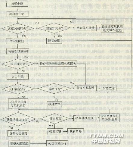 圖3-6 自動(dòng)控制火焰高度、幅寬啟動(dòng)流程 JD型及YM一602型電熱接觸燒毛單元機(jī),皆具有自主知識(shí)產(chǎn)權(quán),獲國(guó)家專利證書(shū)。燒毛接觸面溫度在800~850℃;去除小棉結(jié)效果非常明顯;單元機(jī)具有加工幅向左右加壓微調(diào)機(jī)構(gòu),有效調(diào)節(jié)布面燒毛的均勻度;單元機(jī)設(shè)有升降式保溫裝置,使圓筒表面的清潔工作更易操作;加熱功率PID控制,動(dòng)態(tài)過(guò)程呈平穩(wěn)升降溫;燒毛成本大幅度下降。 電熱接觸式燒毛符合清潔生產(chǎn)要求。 國(guó)內(nèi)對(duì)燒毛火口的研究已達(dá)到國(guó)際先進(jìn)水平。國(guó)產(chǎn)燒毛機(jī)的XH型、MJ型火焰噴射式火口,以及FC型復(fù)合式燒毛精加工火口、YSC外加熱接觸式燒毛單元均成績(jī)斐然,皆步入國(guó)際先進(jìn)行列。然而,在機(jī)電一體化技術(shù)的應(yīng)用方面,與國(guó)外先進(jìn)機(jī)臺(tái)相比仍有差距。例如德國(guó)奧斯托夫(Osthoffsenge)公司早已開(kāi)發(fā)了計(jì)算機(jī)程序化燒毛操作裝置,該裝置采用織物表面茸毛檢測(cè)器與Seng-matie型程序控制器組合。操作者只需設(shè)置坯布纖維的成分和組織結(jié)構(gòu)、質(zhì)量,該系統(tǒng)就可提供一個(gè)相應(yīng)的燒毛程序,對(duì)火焰溫度、布面溫度、燒毛均勻度、燒毛火口位置及布速等參數(shù)實(shí)施程控。其工藝程控系統(tǒng)排除了人為的隨意性,屏幕顯示的人機(jī)操作界面友善燒毛效果重現(xiàn)性好,