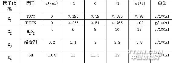 (一)TBCC和THCTS在雙氧水冷軋堆工藝中的應(yīng)用 1、實驗 織物:棉18支氣流紗,175g/m2園形針織坯 化學(xué)品:活化劑TBCC(98%),THCTS(90%)系P&G公司商品 絡(luò)合劑:二乙烯三胺五甲叉基膦酸(diethylene triamine pantakis(methylphosphonicacid,DTPMP)50% 潤濕劑:Vircopin BW 其它化學(xué)品系市售化學(xué)純商品。 實驗采用中心組合設(shè)計法 (Central Composite Experimental Design),取4因子5水平,用Design Expert(V.6.0.8)進(jìn)行實驗設(shè)計