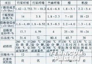 0 前言 竹纖維可分為竹原纖維和竹漿粘膠纖維(屬再生纖維素纖維)兩種。竹漿纖維是利用化學方法制成竹漿粕,再進行噴絲而成;竹原纖維則是利用物理、機械及化學加工,不破壞竹材纖維素結構,只去除纖維素束內外木質素、蛋白質和果膠等,再從中提取竹纖維,可最大限度地保留竹纖維的特性,是一種新型的綠色環(huán)保纖維素纖維。 表1竹原纖維和其它紡織纖維性能比較
