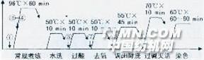 傳統(tǒng)的棉針織物煮練、漂白工藝大多采用燒堿和雙氧水在高溫條件下進行。若燒堿用量控制不當,常會對纖維造成嚴重損傷。由二f燒堿與雙氧水協(xié)同性差,需使用大量的助劑,使工作液穩(wěn)定,進而又導致多次水洗,加重污水處理負擔。 目前,本公司新開發(fā)了新型環(huán)保性的生物酶前處理工藝,并將其應用于棉針織物的精練中。本文將該工藝與傳統(tǒng)精練工藝在工序、效果和成本等方面進行比較,以證明該酶制劑工藝的可行性。1 試驗1.1材料及設(shè)備 織物14.8 tex/4.4 tex(40 D)棉針織物 助劑生物精練酶DM-8654,酸性纖維素酶DM-8636,高濃非離子滲透劑DM-1361(廣東德美精細化工股份有限公司)。 設(shè)備立信ECO-38常溫染色機。1.2試驗方法1.2.1傳統(tǒng)前處理工藝 配方/(g/L) ①除油滲透劑201 1.0~2.0 ②碳酸鈉 3.0③雙氧水(27.5%) 6.0④燒堿 2.0⑤醋酸 1.0⑥酸性纖維素酶DM-8636 0.80⑦去氧酶DM-8697 0.10工藝條件