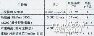 0 前言 亞麻/棉織物綜合棉和亞麻兩種織物的優(yōu)點(diǎn),克服了棉織物尺寸穩(wěn)定性差和亞麻織物彈性差、易折皺的缺點(diǎn),具有理想的服用性能。傳統(tǒng)的亞彬棉織物退漿、煮練大多采用強(qiáng)堿高溫、次氯酸鈉漂白,雖然能獲得很好的毛效和白度,且有效地去除麻皮,但需要消耗大量化學(xué)試劑、能量、水以及時(shí)間,而且氯漂對(duì)環(huán)境有污染。因此,尋求一種綠色工藝以替代該類織物的高溫強(qiáng)堿前處理工藝,其社會(huì)和經(jīng)濟(jì)效益顯著。 利用酶的高效性、專一性和溫和的反應(yīng)條件,以及對(duì)環(huán)境無污染的特點(diǎn),以替代傳統(tǒng)的堿退漿、煮練,可省去氯漂工序,降低廢水中的COD、pH值和色度等,減少對(duì)纖維的損傷,實(shí)現(xiàn)亞彬棉紡織產(chǎn)品前處理的清潔化和產(chǎn)品的高檔化。本課題通過各種試驗(yàn),確立了酶工藝。1試驗(yàn)1.1材料 織物53.6/53.6,49/46,亞彬棉(55/45)織物。 酶制劑(見表1)。 化學(xué)試劑NaOH(100%,固態(tài)),H202(30%),硅酸鈉(固態(tài)),Na2CO3,EDTA,碘,碘化鉀,尿素,硼酸,硫酸,乙醇,過硫酸鉀,亞硫酸鈉,磷酸三鈉,次氯酸表1生物酶制劑的種類
