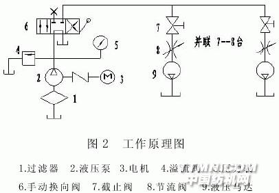 如圖 2 所示: 啟動(dòng)電機(jī) 3, 液壓泵 2 開始工作, 此時(shí), 系統(tǒng)無壓。當(dāng)手動(dòng)換向閥 6 動(dòng)作時(shí), 系統(tǒng)建立 壓力, 調(diào)整溢流閥 4 至所需壓力, 示數(shù)由壓力表 5 讀取。打開截止閥 7, 同時(shí)調(diào)節(jié)節(jié)流閥 8, 使液壓馬 達(dá) 9 達(dá)到 5~6r/min。