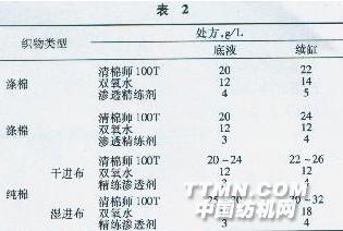 退煮處方,g/L 燒堿 25~30 精練劑 5~6 亞硫酸鈉 5~6 軋液溫度,℃ 80 軋余率,% 90 汽蒸溫度,℃ 95 汽蒸時間,min 70