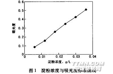 圖1rain,并不斷攪拌;加入60 mL蒸餾水,滴人酚酞2滴,加入6 g/L NaOH至溶液呈淡紅色,再加入2 g/LHAc數(shù)滴消去淡紅色。過濾,將濾液轉(zhuǎn)至250 mL容量瓶中,以蒸餾水稀釋至刻度。顯色穩(wěn)定后立即進行比色,測定吸光度,與標(biāo)準(zhǔn)曲線相比較,求出所測淀粉液濃度和織物上淀粉含量。根據(jù)下式計算退漿率。退漿率,% =(A0一A1)/A0×100%1.2.2 毛效測定將待測織物沿經(jīng)向剪成兩塊5 cm×22 cm的布條,以重鉻酸鉀溶液作為測試液,于27cI=恒溫條件下觀察測量,并記錄