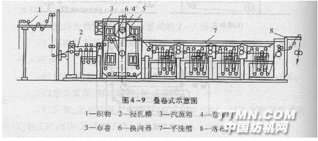 L形箱結(jié)構(gòu)簡(jiǎn)單,操作方便。堆積布層較薄,織物不受重壓,所以褶皺痕跡較輕,而且張力和摩擦都小。因?yàn)樾Ч^好,故廣為工廠采用。由于J型箱中堆積布層較厚,織物受壓加重,容易產(chǎn)生橫向褶皺而且容易擦傷。因此對(duì)于中、深色的染色織物不宜采用。 (3)疊卷式。如圖4—9所示。