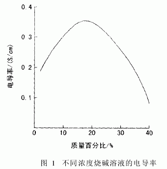 如圖1所示,與電導(dǎo)率對應(yīng)的燒堿溶液濃度具有二值性。在濃度較低的區(qū)域,溶液的電導(dǎo)率隨燒堿濃度的增加而增大;但溶液電導(dǎo)率增加到一定數(shù)值后,隨著濃度的升高,反而減小。由于曲線在拐點處較平緩,所以在拐點處的分辨率最差,因此測量時必須避開拐點及其附近范圍。若從拐點處分段測量,則溶液濃度在各段范圍內(nèi)與電導(dǎo)率有近似比例關(guān)系,因此,通過檢測溶液的電導(dǎo)率就可計算出堿液的濃度。