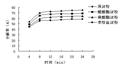 | 圖1 碘量法測(cè)定中溫α-淀粉酶對(duì)各類淀粉的分解率 |