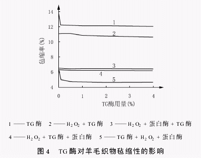 張瑞萍蔡再生(1東華大學(xué)化學(xué)化工學(xué)院,上海 226007;2南通大學(xué)化學(xué)化工學(xué)院,江蘇南通 226019) 摘要:文章探討了不同前處理劑、蛋白酶和TG酶對羊毛織物抗氈縮性能及對纖維損傷和織物強力等的影響。結(jié)果表明:通過TG酶的作用,可以提高織物的強力,降低纖維的堿溶度,使羊毛纖維的損傷得到補救;采用氧化前處理與蛋白酶及TG酶三者結(jié)合新工藝,可以在保證纖維損傷小的前提下,提高織物的抗氈縮性。關(guān)鍵詞:羊毛織物;蛋白酶;TG酶;防氈縮整理中圖分類號:TS19229 文獻(xiàn)標(biāo)識碼:A 文章編號:10031456(2007)01001004 近幾年,由于環(huán)境問題日益為人們所重視,尋找合適的酶制劑代替氯化工藝已成為羊毛防氈縮研究的熱點。用蛋白酶對羊毛進(jìn)行減量處理,進(jìn)而使羊毛織物達(dá)到防氈縮目的的研究國內(nèi)外均見報道。但由于蛋白酶對羊毛處理的不均勻性,造成了羊毛纖維較大的損傷,限制了其工業(yè)化應(yīng)用。本研究選用一種新型生物酶,與傳統(tǒng)的氧化、蛋白酶處理結(jié)合共同處理羊毛織物,使蛋白質(zhì)改性,達(dá)到防氈縮的同時,還可減少織物強力損失。1 實驗部分11 實驗材料及主要化學(xué)藥品純毛織物,釋氯劑DCCA,二氯異氰尿酸鈉(工業(yè)用),次氯酸鈉(分析純),雙氧水30%(分析純),水玻璃(工業(yè)品),蛋白酶(工業(yè)品),TG酶(日本)。12 前處理H2O2處理條件:溫度50℃,浴比1∶20,時間60min,JFC適量;DCCA處理條件:溫度25℃,浴比1∶20,時間60min,JFC適量,pH值40;NaClO處理條件:溫度25℃,浴比1∶20,時間60min,JFC適量,pH值30;脫氯工藝:Na2SO33%(owf),溫度30℃,浴比1∶20,時間20min,NaCO3調(diào)節(jié)pH值至8~9之間處理8min,溫度45℃。1.3 酶處理根據(jù)工藝參數(shù)配置酶液,把羊毛浸入其中,在一定溫度下處理一定時