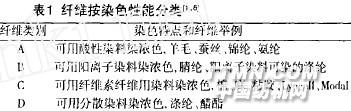 2 纖維按染色性能的分類法(ABCD法)為了便于討論與混紡交織制品相關(guān)的問題, 可按纖維的主要染色性能對其分類, 簡單的ABCD分類法見表1。A類纖維是指能用酸性染料染成堅牢的深濃色的纖維, B類纖維是指能用陽離子染料染成堅牢的深濃色的纖維, C類纖維是指能用纖維素纖維用染料(如直接、活性、還原、硫化、冰染染料等)染成深濃色的纖維, D類纖維是指能用分散染料染成堅牢的深濃色的纖維。