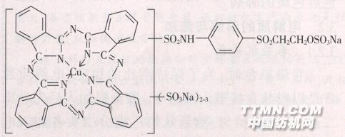 崔浩然 1 問題的提出 中溫型活性翠藍(lán)(C.I.活性藍(lán)21)色澤艷亮,是纖維素纖維染亮綠或艷藍(lán)必不可少的染料。然而,在浸染染色時(shí),該染料卻容易產(chǎn)生色澤不勻、色點(diǎn)色漬、牢度低下,以及提深性不佳等問題。2 問題的分析 活性翠藍(lán)存在上述問題的根源.歸納起來有二個(gè)。2.1 活性翠藍(lán)的分子結(jié)構(gòu)特殊 活性翠藍(lán)屬銅酞菁染料,其分子結(jié)構(gòu)成立體狀態(tài),體積碩大,嚴(yán)重缺乏線性,這就產(chǎn)生了先天性缺陷。其結(jié)構(gòu)如下: