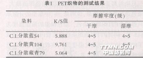 PTT(聚對苯二甲酸丙二醇酯)是一種新型的聚酯產(chǎn)品.PTT 織物具有優(yōu)良的特性。在化學(xué)纖維應(yīng)用領(lǐng)域中.PTT纖維綜合了錦綸的柔軟性(并具有更好的色牢度)、腈綸的膨松性(而避免了磨損傾向)、滌綸的抗污性(卻具備了很好的手感).再加上PTT本身固有的彈性功能.將各纖維的優(yōu)良性能聚于一體.成為當(dāng)前國際上新開發(fā)的熱門高分子新材料之一[1]. 1 染色1.1 材料 資料上查得PTT纖維用分散染料染色最好[2].故本實驗取用我公司現(xiàn)有的幾種染料試驗染色工藝.所用染料為高溫型的C.I.分散藏青79.中溫型的C.I.分散黃104.低溫型的C.I.分散藍(lán)54三種。實驗所用的織物是由兩根短纖紗合成的紗線單向針織而成。用于比較的PET織物是與之相同的。實驗中醋酸用于調(diào)節(jié)pH值;染色使用亞磯工業(yè)股份有限公司的染色小樣機(jī)。1.2染后測定1.2.1 色深值 染后織物顏色的深淺用K/S值來表示.而K/s值是通過基于Kubelka-Munk公式的BYK?Gardner分光光度計測得的:K/S=(1-R)2/2R式中:R是在給定織物的最大吸收波長處測得的反射率。1.2.2染色摩擦牢度 按照GB/T3920-1997測試方法。2染色結(jié)果與討論 本實驗用3種染料分別在不同溫度、pH值、染色保溫時間和浴比等4個方面對PTT織物染色并與PET織物的染色結(jié)果相比較來討論P(yáng)TT纖維的染色工藝.、實驗中PET纖維染色工藝為溫度130℃,pH值4.5.保溫時間40 min,浴比1:30,染料用量(0.w.f.)為1%.PET織物染色測試結(jié)果如表1。