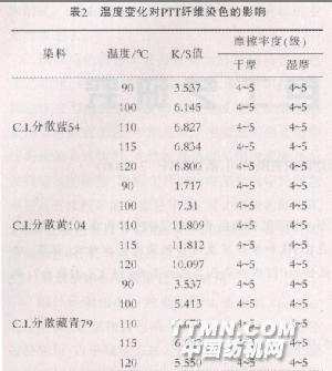 2.1 溫度變化探討PTT的染色性能 同定保溫時間30 min、浴比1:30和pH值為5不變.改變?nèi)旧珳囟龋接憸囟茸兓瘜TT染色的影響,染色結(jié)果如表2。