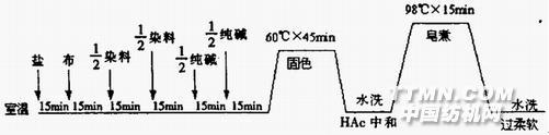1.2 染色 莫代爾針織布一般采用活性染料進行染色。莫代爾纖維對染料助劑比較敏感,而且對活性染料的親和能力很強,染料一旦上染就不易移染,很容易產(chǎn)生色花和色斑。可采用三項措施來解決上述難點:第一項是在染缸中先加適量的精鹽或元明粉,然后進布在中性鹽浴中充分轉(zhuǎn)勻,再緩慢分次加入染料,以保證莫代爾纖維在中性鹽浴中緩慢接觸染料,保持上染速率的溫和平衡,從而避免了色花和色斑現(xiàn)象;第二項是選擇重現(xiàn)性、配伍性及勻染性好且對莫代爾纖維直接性中等的染料,綜合考慮性能價格比等因素,選用上海染料化工八廠的EF型染料,大大減少了莫代爾針織布的返修率,因而在一定程度上解決了莫代爾針織布返修困難的問題;第三項措施是采用香港立信公司的常溫溢流噴射染色機進行染色,較大程度地保證了染出布匹的質(zhì)量。下面以實際生產(chǎn)情況舉例說明。