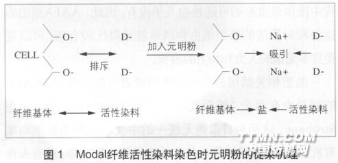Modal是一種新型高濕模量的再生纖維素短纖維。它采用歐洲櫸木漿粕經(jīng)紡絲制成,具有良好的吸濕性、柔滑飄逸性和舒適性,且生產(chǎn)加工過程清潔無毒,其紡織品的廢棄物也可自然降解,是品質(zhì)與舒適的象征。根據(jù)產(chǎn)品風(fēng)格、生產(chǎn)成本和市場的需要,Modal產(chǎn)品可在其生產(chǎn)的各個環(huán)節(jié)進(jìn)行染色,如散纖維、紗線、織物、成衣染色等。為使成紗獲得某種效果,如較豐富的色彩層次,朦朧的感覺,或為減少紗線的色差,可采用散纖維染色方式。染后不同色澤的Modal纖維按特定比例與白Modal纖維混紡,便可獲得絢麗多彩、風(fēng)格獨特的 Modal混色紗,增加了紗線的附加值。 上述的Modal混色花紗“先染色,再紡紗”加工方式,對Modal散纖維的染色均勻性、染料和加工工藝的要求較低,且出現(xiàn)色偏或色花等質(zhì)量問題后也可在后道紡紗生產(chǎn)中進(jìn)行彌補,但其缺點在于市場反應(yīng)速度慢,著色Modal纖維半制品的數(shù)量多。為適應(yīng)市場需求并做出快速反應(yīng),將陽離子改性Modal纖維以特定比例和Modal纖維均勻混合并紡紗,制得差異化改性Modal紗線(簡稱改性紗)。該改性紗應(yīng)用活性染料進(jìn)行染色,可一次性染出花紗風(fēng)格。本文重點介紹Modal散纖維的陽離子改性機理和工藝,差異化改性Modal紗線的制作方法,并對其織物的浸染工藝進(jìn)行了分析和探討。1 差異化改性Modal紗1.1陽離子改性機理 Modal散纖維通常使用活性染料染色,在堿性染浴中,活性染料呈陰離子性,而Modal纖維也呈陰離子性,兩者相互排斥,需大量元明粉促染,如圖1所示。染色廢水中含高濃度染料和鹽,嚴(yán)重污染環(huán)境。