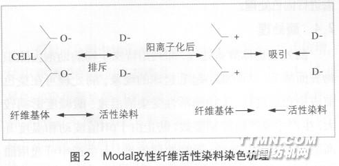 應(yīng)用陽離子改性劑,如含環(huán)氧基的季胺鹽類化合物,可將Modal纖維陽離子化。改性劑中含有反應(yīng)性基團(tuán),可在氫氧化鈉等堿劑存在下,與Modal纖維素纖維中的羥基進(jìn)行反應(yīng),而它們本身又自帶正電荷,所以可使Modal纖維變?yōu)楹栯x子基的纖維。Modal