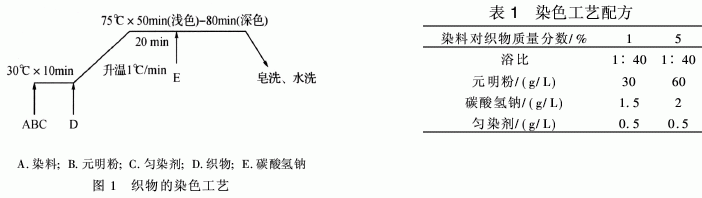 1.4 拼色試驗以基本染色工藝配方為中心,左右調(diào)節(jié)保溫溫度、保溫時間、元明粉和碳酸氫鈉用量等參數(shù),重點(diǎn)考慮同色性問題,挑選出較好的染色工藝進(jìn)行拼色試驗。采用相同比例的三原色拼色,深色時染料用量對織物質(zhì)量分?jǐn)?shù)為3%,淺色時染料用量對織物質(zhì)量分?jǐn)?shù)為0.6%。1.5 表觀色澤(K/S)值和色差測定
