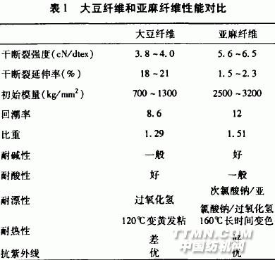 1 原料與織物在制定加工工藝中,既要考慮亞麻纖維的性能,又要兼顧大豆纖維的特點(diǎn),以充分發(fā)揮兩者的優(yōu)良特性。大豆纖維與亞麻纖維部分性能指標(biāo)見(jiàn)表l。