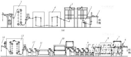 1—進(jìn)布裝置 2、6—均勻軋車 3—紅外線烘燥機(jī) 4—橫導(dǎo)輥熱風(fēng)烘燥機(jī)