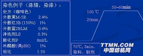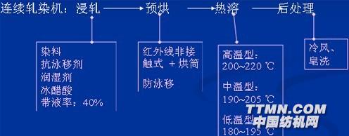 3、熱溶(熔)染色法170~220 ℃無水染色。熱溶處理僅1~2min.,染料瞬間入織物。熱溶染色工藝: