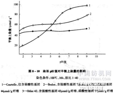 1.染色工藝因素 (1)pH值影響 平衡上染量隨染浴pH值提高而增大,含弱酸性基團的纖維,可增加其上染染座;強酸性不明顯 隨pH值提高,染料吸附速率增大,不易勻染 對含羧酸基的腈綸影響更為顯著,含磺酸基的腈綸上染速率影響較小 pH值在4~6范圍內(nèi),大部分染料和纖維性質(zhì)穩(wěn)定,理想的在4.5~5.5之間 在實際染色中,采用緩沖體系來保持染浴中pH值的穩(wěn)定