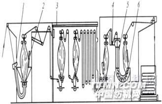 圖2—10 圓筒針織物連續(xù)染色機1—染槽 2—沖氣裝置 3—汽蒸箱4—氧化劑槽 5—高速沖洗 6—氧化J形箱