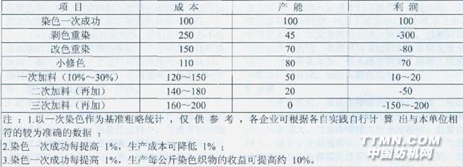 湯鑄先 節(jié)能減排,降低消耗,保護環(huán)境是實現(xiàn)紡織工業(yè)可持續(xù)發(fā)展的戰(zhàn)略,印染環(huán)節(jié)是整個紡織工業(yè)實現(xiàn)節(jié)能減排的重中之重,紡織工業(yè)80%的用水消耗在印染環(huán)節(jié),60%的排放污水源自于印染行業(yè)。“染色一次成功”是最直接、最有效的節(jié)能減排上程,是企業(yè)利潤的核心,也是提高產(chǎn)品質(zhì)量,提高產(chǎn)品檔次的系統(tǒng)工程。 提高染色一次成功是染整企業(yè)的共同期待,是全國乃至世界各國研究探索的熱點,是一項沒有終點的探索研究課題。針織物染色效益分析如表1所示。 染整工程師的價值體現(xiàn)在“工藝設計”,成果出白于“優(yōu)質(zhì)低耗”。“執(zhí)行品質(zhì)標準,規(guī)范生產(chǎn)管理,規(guī)范工藝技術(shù)”由思考力到?jīng)Q策力再到強硬的現(xiàn)場執(zhí)行力,三合力來保證“染色一次成功”的實現(xiàn)。 “染色一次成功”是指從合格的毛坯布經(jīng)染、整全過程后符合約定的質(zhì)量標準的凈坯布一次性成功。 提高染色一次成功率,把回修率控制到最低點是漂染企業(yè)共同的期待,是企業(yè)“管理上規(guī)范、產(chǎn)品上檔次、質(zhì)量上水平、產(chǎn)品上規(guī)模”的必然結(jié)果,也是“優(yōu)質(zhì)低耗”、經(jīng)濟效益的一面鏡子,更是生產(chǎn)技術(shù)主管智慧、能力、價值的體現(xiàn)。