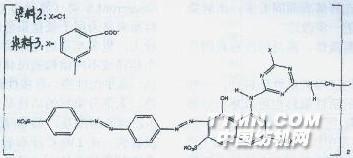 這是兩只分子結構很大的雙活性基染料,它們實際上是由乙二胺做橋基的雙活性基染料,乙二胺鏈是直接接在兩個均三嗪環(huán)上,和以往的這類染料有所不同,如前所示那樣,以往的雙煙酸均三嗪類染料的煙酸均三嗪活性基往往通過亞胺基接在染料芳環(huán)體系上,或者通過芳二胺將兩個活性基接在一起,即均三嗪環(huán)直接通過亞胺基接在芳環(huán)上,由于芳胺基給電子能力較脂肪胺基給電子能力弱,所以均三嗪環(huán)接芳胺基的活性染料反應性較強些,因此在堿性和高溫時容易水解。這可從前示圖2看出,當染色溫度升到130℃時,雙煙酸均三嗪結構的上染率已不到原來的一半,因此130℃染色時固色率提高不多。水解染料達130℃后幾乎成直線增加。為了克服這個缺點,近期研發(fā)的雙煙酸均三嗪染料則以脂肪二胺作橋基,由于它給電子能力相對較強,染料穩(wěn)定性較好,在高溫下不易水解,另外,乙二胺鏈柔順性好,染料分子芳環(huán)共平面性較好,染料的直接性較高,加上此橋基的亞胺基的氫原子不易電離,性能穩(wěn)定,所以這種結構的染料在130℃中性染色的固色率比芳胺橋基的有明顯提高,這也是近年來開發(fā)的許多活性染料以脂胺胺作橋基的主要原因。