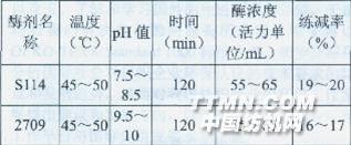 試驗表明,采用酶劑脫膠,溫度一般控制在40~50℃、pH值為7~9、時間120min的條件下,練減率均可以達(dá)到16%~20%,基本達(dá)到脫膠的要求。生產(chǎn)中,采用了中性蛋白酶S114系列,練減率達(dá)到19%左右,滿足生絲染色及后加工質(zhì)量的要求。1.2.1.2酶脫膠工藝過程。先用純堿和表面活性劑進(jìn)行前處理,使絲膠膨潤、軟化,從而使酶容易發(fā)