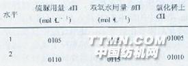 圖2氯化稀土氧化還原體系染色工藝曲線2結(jié)果與分析2.1 氯化稀土氧化還原染色工藝的確定 在弱酸性黃染料1%(owf)、滲透劑1.5g/L、元明粉1O%(owf)、pH值6、浴比1:50、染色時(shí)間1h的前提下,設(shè)定硫脲、雙氧水、氯化稀土的用量為變量,進(jìn)行正交試驗(yàn)。正交試驗(yàn)因素水平見(jiàn)表1,結(jié)果見(jiàn)表2。表1 正交試驗(yàn)因素水平表