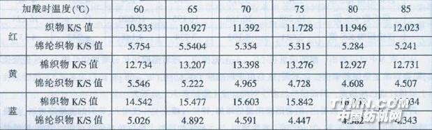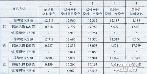 從上表5中可以看出:隨著加酸溫度的提高(時間的推遲),棉纖維上K/S值增大,即染料的上染固著率增加。當溫度在80℃左右時加酸,棉纖維上K/S值變化不大。這是由于60℃后繼續(xù)升溫,活性染料在棉纖維上還在繼續(xù)反應.染料的上染固著率增加。當溫度到達在80℃左右時,反應基本完成,此時溫度的提高(延長時間),染料的上染固著率變化不大,甚至有下降的可能(染料有斷鍵的可能)。 再從上表5中還可以看出:隨著加酸溫度的提高(時間的推遲),錦綸纖維上K/S值變小,染料的上染率有所下降。當溫度在80℃左右時加酸,錦綸纖維上K/S值變化不大。這是由于棉纖維上染料的上染固著率增加,染色殘液中染料量減少.上染錦綸纖維的染料量也減少。 3.5活性/酸性(中性)染料同浴染色試驗: 由于活性染料在兩種纖維上的上染率不同.一般錦綸纖維的色澤比棉纖維淺.需用酸性或中性染料上染錦綸纖維。因而進行活性與酸性(中性)染料同浴染色。通過試驗,結果如下表6所示: 表6:雅閣素(活性)染料與酸性、中性染料上染錦/棉織物的K/S值