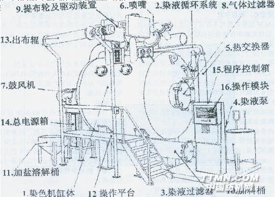 圖.THEN氣流染色機(jī)示意圖3.2三個(gè)循環(huán) 氣流染色機(jī)看起來類似O型機(jī),但實(shí)際上有很大的區(qū)別,在氣流染色機(jī)中存在三大循環(huán)。 (1)氣流循環(huán),與常規(guī)染色最大的不同是推動(dòng)布運(yùn)行的是帶有染液的霧化氣流,所以染色機(jī)內(nèi)存在氣流的循環(huán),染缸內(nèi)的空氣通過空氣過濾器后由一個(gè)強(qiáng)有力的風(fēng)機(jī)加速,形成強(qiáng)大的高速氣流,該氣流通過空氣輸送管道,分別送到各個(gè)噴嘴,在噴嘴里高速氣流將染液帶出瞬問霧化,從噴嘴里噴出的帶有霧化染液的氣流帶動(dòng)織物運(yùn)行,同時(shí)霧化的染液均勻地接觸織物。從噴嘴噴出的氣流進(jìn)入染缸內(nèi),經(jīng)過卒氣過濾器又吸回風(fēng)機(jī),經(jīng)風(fēng)機(jī)加速后重新輸送到噴嘴,如此反復(fù)循環(huán)。