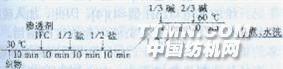 牛奶蛋白纖維是一種新型再生纖維,其纖維強度高、收縮小、防霉和防蛀,且柔軟、親膚、吸濕和透氣。印染工作者對其染整加工進行了深入的研究,并取得了一定進展。牛奶纖維價格昂貴,其商品在市場上大多是混紡織物。本項目針對莫代爾/牛奶纖維混紡針織物,采用雙活性基活性染料染色,考察染色織物的強力和色牢度,并優(yōu)化染色工藝,供染整企業(yè)生產(chǎn)牛奶織物參考。1試驗部分1.1材料與儀器藥品硫酸鈉、碳酸鈉、碳酸氫鈉(均為分析純,成都科龍化學(xué)試劑廠);Lanasol橙RG,紅5B,藍3R(亨斯邁公司);Cibacron黃FN22R,紅FN2R,藍FN2R(亨斯邁公司);活性黃M23RE,紅M23BE,深藍M22GE(上海染化八廠)。織物 莫代爾/牛奶纖維(70/30)混紡針織物17tex×17tex118根/10cm×114根/10cm(經(jīng)退煮漂,山西恒天新纖維紡織有限公司)。儀器FA21 04S型電予天平(上海精密科學(xué)儀器有限公司),SCTSF600電子測色配色儀(Datacolor公司),UV22550型紫外可見分光光度計(日本島津公司),Y5712B型摩擦色牢度試驗儀(溫州紡織儀器幾,YG026N型電子織物強力實驗儀(山東萊州電子儀器有限公司),常規(guī)振蕩式小樣染色機和W212A型耐洗色牢度試驗儀(四川實驗儀器廠),YG0312250型頂破強力測度儀(溫州方圓儀器廠)。1.2染色方法1.2.1 Lanasol染料染色方法染色處方染料/%(owf) 2碳酸鈉/(g/L) 5硫酸鈉/(g/L) 40滲透劑JFC/(g/L) 0.5浴比 1:50工藝曲線