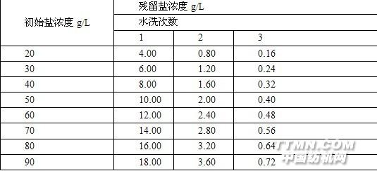 染后需立即洗除鹽、堿、助劑、未固色的浮色,水洗不及時,不凈,會產(chǎn)生色花和色牢度差等染疵。水洗時宜先用冷水,再用溫水,后用熱水洗凈鹽、堿后才可皂煮。表2 水洗后殘留鹽的濃度